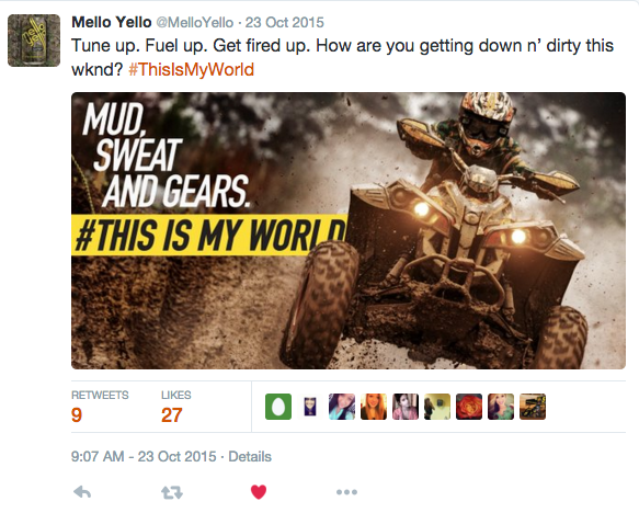 Establish Mello Yello's relevance to the lifestyle of the work proud man. Celebrate the individuals who represent the MY brand through the idea of "This Is MY World." With partnerships with RealTree and NHRA, MY is able to develop exclusive content that fuels our consumer's personal passions.